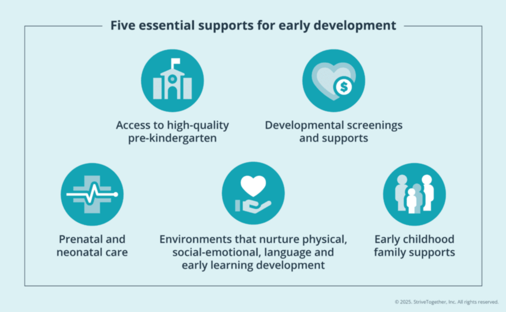 These elements work together to create the conditions children need to grow, explore, and learn. When families have access to stable housing, nutritious food, safe neighborhoods, and high-quality early learning, children are more likely to meet developmental benchmarks by entering kindergarten.